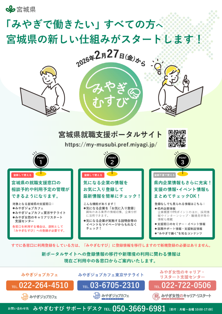 2026年2月27日より「みやぎむすび 宮城県就職支援ポータルサイト」が新たにオープンしました。「みやぎで働きたい」すべての方にご活用いただける宮城県の新しい仕組みです。ぜひ就職活動での情報収集やサポートの利用に本サイトをご活用ください。