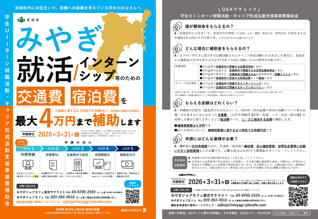 宮城県では、県外に在住する学生の方及び既卒3年以内の方が、宮城県内の企業へ就職活動又はキャリア形成活動を行う際に、住所地と宮城県内の目的地の間の移動にかかる交通費や宿泊費に対して、補助を行っています。